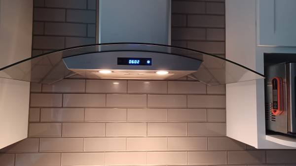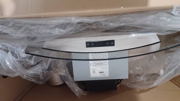 New in box glass 36" hood vent. Same as installed photo. Damaged screen.
