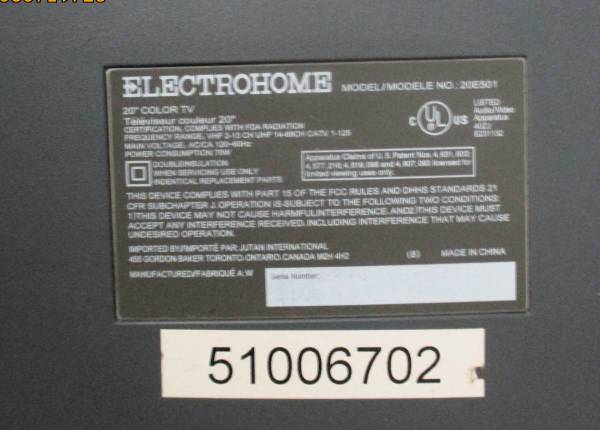 #2 TV is a Electrohome 20 inch with remote Model 20E501 Works good regardless of the plastic end damage on the one corner, (see pictures) I used it in my garage but never use it anymore as I cancelled my cable service and only use apps with the internet.