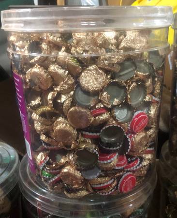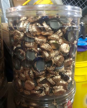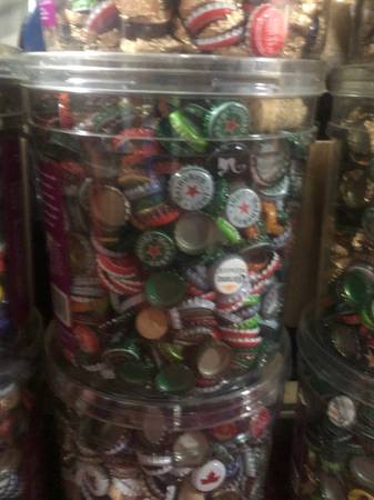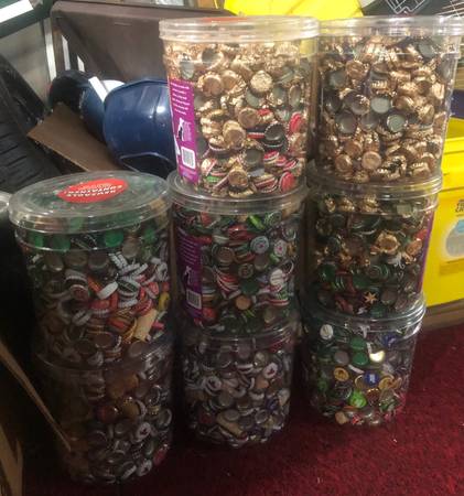 9” x 9” Round Containers of Assorted Bottle Caps Collected over a few years. Great for a craft project. 8) tubs available. $5 each tub
