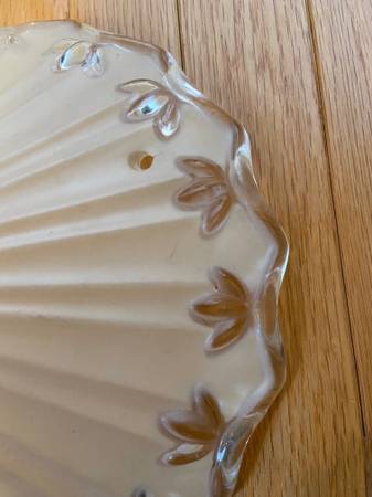 I have a Vintage Glass/Art Deco Ceiling Lamp Shade for sale. It is cream/beige in color and hangs by using 3 chains put through the 3 holes that are in the lamp shade. Clear glass around the outer edge, center piece and in the fleurette design around the outer edge.