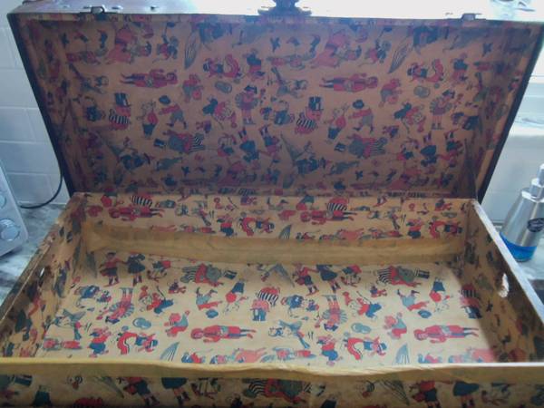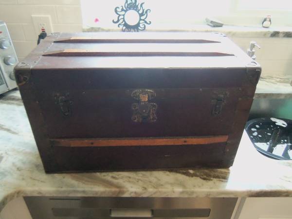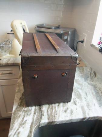 Selling a vintage trunk / chest. Do not know what company made it. Measures 20 inches wide. 12 inches tall. 10.5 inches deep. Side handles are broke off. Beautiful trunk. Please let me know if you...