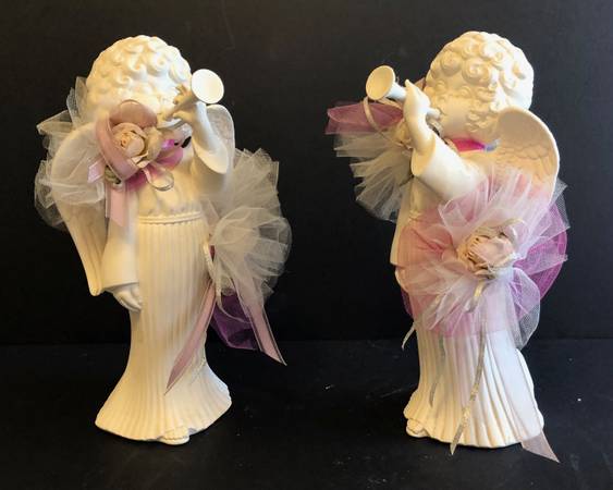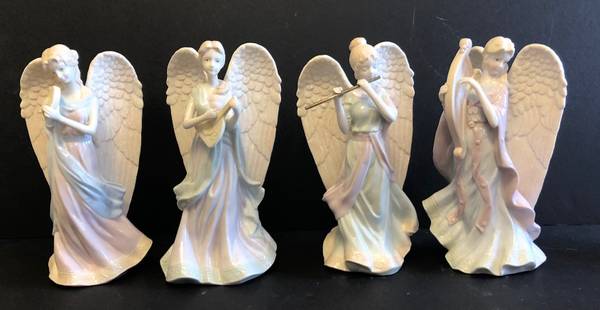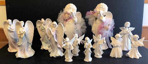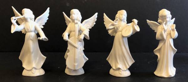 This is a lot of thirteen vintage angel figurines all playing some sort of musical instruments. There are two sets of four pieces, two sets of two pieces and one single one. There is much value here, but we just need to clear out the house and are selling them all for $25. Please see the photographs for complete details. Happy bidding.