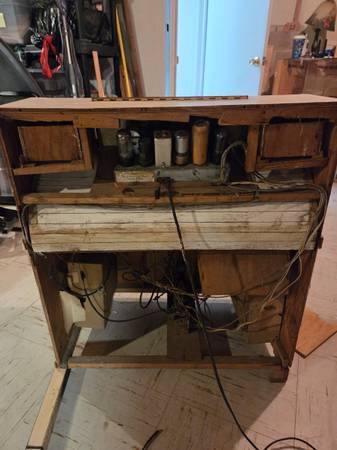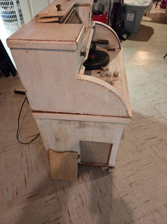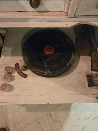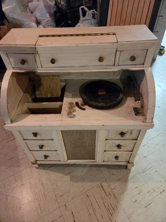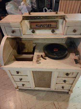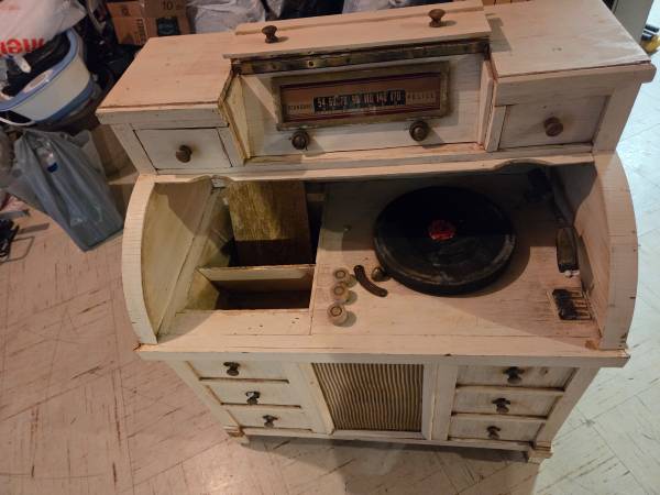 Just dropped the price, come get it for $25 never seen anything like this, I bought it in hopes of restoring it but I'll be honest I'm lost. Great winter project! I dont know if the scanner or record player work and I have to say whoever build the cabinet back in the day was quite the craftsman. I cleaned it up pretty good compared to what it looked like.(last picture) and was going to go to home depot and replace a few missing wood pieces and paint it antique white but then I thought I know nothing about these antique tube radios. We moved into a tiny ranch style condo and I have no room to work on this now. This would be a jewel if you do know anything about them. Even for something to just look at and enjoy. The little white tag is what kind of needle the record player takes it feel off the arm. Im putting it on craigslist for the time being then off to the antique store to sell. A real cool and fun project. Please text (248) nineoneeight one5twotwo if seriously interested.