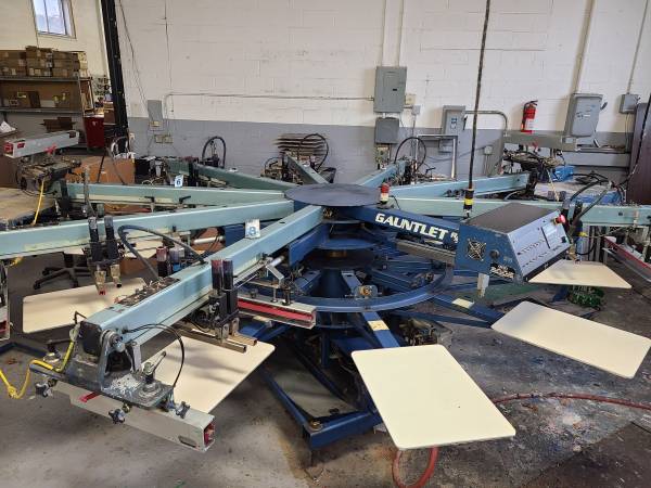 We have a 2000 M&R Gauntlet 10/8 eight color automatic screen printing press. The press also comes with 2 Uni-Flash units. We also have a Hix 3610 Micro dryer going with the press. Both units...
