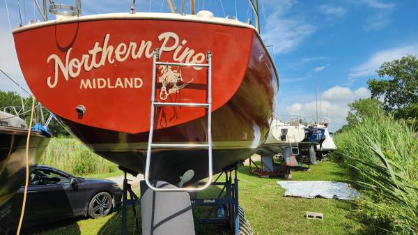Highly coveted Ontario 32 for sale. "Northern Pine" is in good condition. Doyle Boston main sail and genoa 150 were bought in 2019 have seen very little use and are like new. The teak woodwork inside and outside has been very well maintained and adds a look of luxury. A partial list of equipment: harken roller furler, new clear windows in dodger, cockpit cushions, Edson pedestal steering, complete valve and seal rebuild on Jabsco manual toilet, all Atkins and Hoyle ports open for excellent air circulation, with new seals on most, two hatches have new glass and seals, SS BBQ, one brand new battery and one 5 years old but in great shape, 35 lb CQR anchor on bow pulpit roller with manual windlass, spare Danforth anchor and rode, 5 year old ProMariner ProSport20HDPlus 20 amp, 3 bank charger, cradle and much much more. On the hard at St Clair Marine in Lasalle, ON.