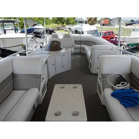 This is the ultimate floating patio, perfect for lazy days on the lake, fishing with friends, or hosting a sunset cruise. It's powered by a super reliable and fuel-efficient 200 HP Yamaha 4-stroke outboard that starts right up and runs strong. No smoke, no fuss, just smooth power.