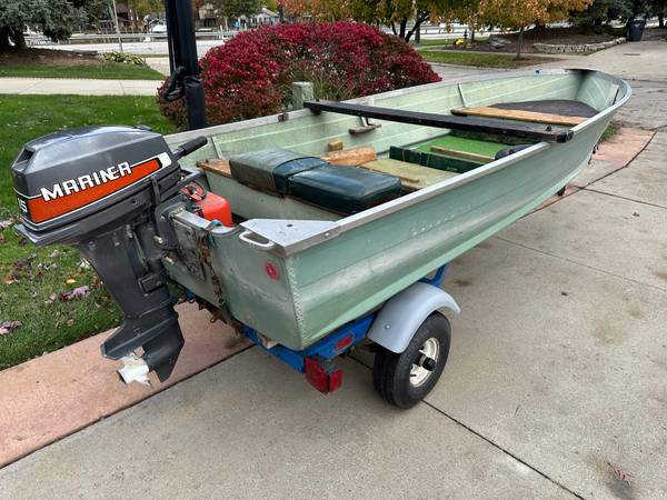 For sale is a well-kept 14-foot fishing boat with a 15HP Mariner outboard motor and trailer. This boat has been well maintained, garage kept, and owned by the same person since new.