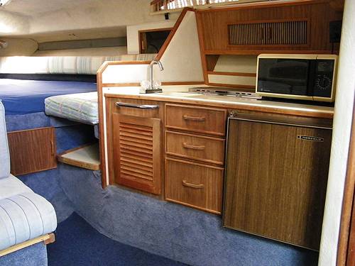 V-birth, convertible settee, and mid stateroom
