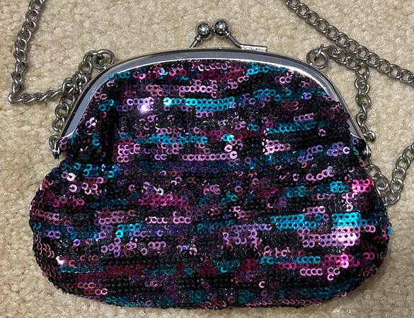 Place 89 Small Sequins Bag - Black/Purple/Blue Silver Chain Strap Clasp Clutch Purse Measures: 4.5" Tall x 5.5" Wide The silver hardware and accents complement the metallic texture, creating a...