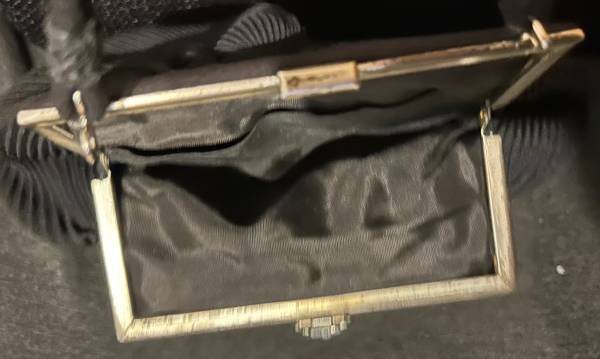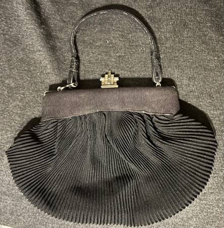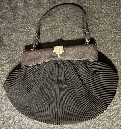 Vintage Elegant Black Pleated Cloth Evening Handbag with Rhinestone Clasp 8" Wide x 5 3/4" Tall