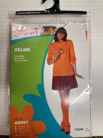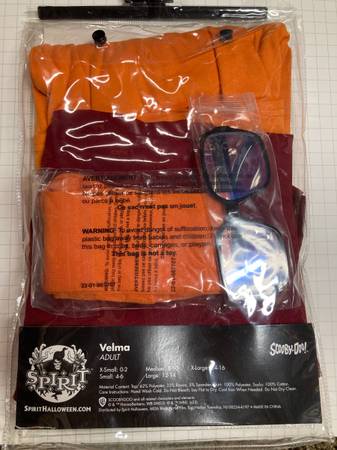 Get ready for Halloween or Cosplay events with this Officially Licensed New in package Scooby Doo Velma costume from Spirit Halloween. The Velma costume includes a shirt, skirt, glasses and socks, all in a vibrant Orange and Maroon color combination.
