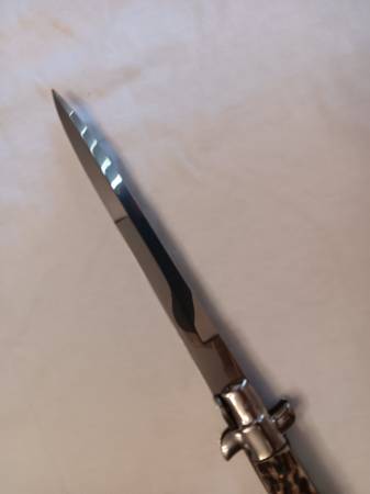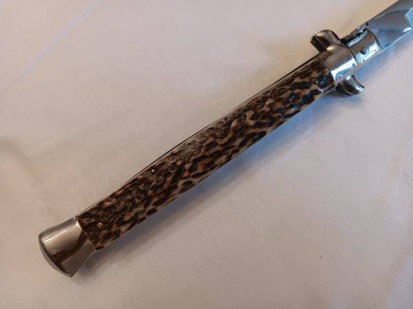 VINTAGE FRANK B ITALIAN STILETTO 13'' OAL. GENUINE STAG SCALES, WITH BAYONET BLADE. OPENS STRONG AND LOCKS UP SOLID AND TIGHT WITH NO MOVEMENT IN BLADE WHEN OPEN. SCALES ARE EXCELLENT WITH NO MOVEMENT, CHIPS OR CRACKS. SLIDE SAFETY WORKS GREAT. TANG IS STAMPED FRANK B ITALY, HARD TO FIND VINTAGE STILETTO IN THIS SIZE AND CONDITION. WILL MAKE AN EXCELLENT ADDITION TO SOMEONES COLLECTION. PLEASE CALL OR TEXT NUMBER PROVIDED. WILL NOT SHIP THANKS FOR LOOKING