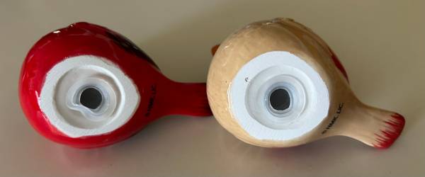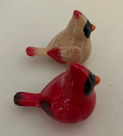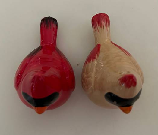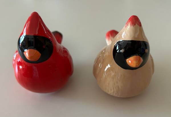 Hallmark Ceramic Cardinal Birds Salt and Pepper Shakers The Male and Female Ceramic Cardinal Salt and Pepper Shakers are from HMK, Inc. Measures: 2 1/2 inches tall and 3 1/2 inches wide