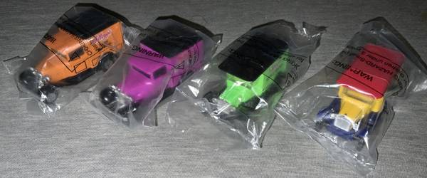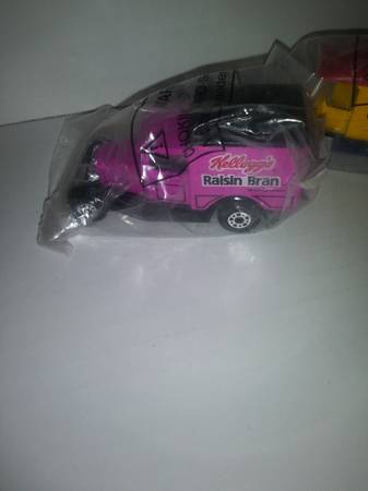 Kellogg’s Cereal Vintage Matchbox Cars Set of 4 Ford Model It consists of 4 vehicles: Frosted Mini-Wheats (Orange), Raisin Bran (Purple), Apple Jacks (Green), Corn Pops (Yellow).