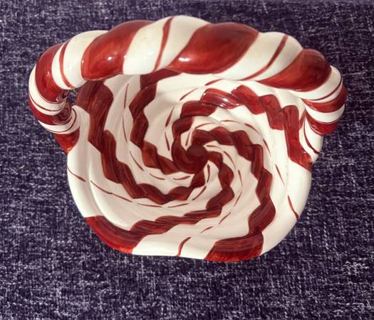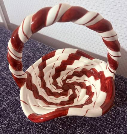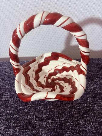 Lillian Vernon red and white ceramic braided candy basket, candy cane striped basket, peppermint stripe basket/dish