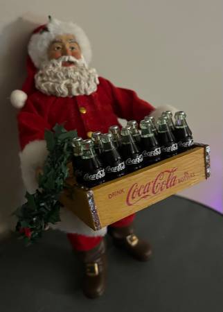 Santa Claus Coca-Cola Crate Fabriche Ceramic Sculpture Coke Kurt Adler Christmas Figurine Santa is holding a Case of Coca-Cola bottles. Measures: 11 inches tall by 6 inches wide