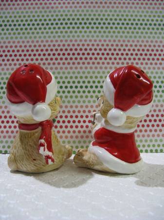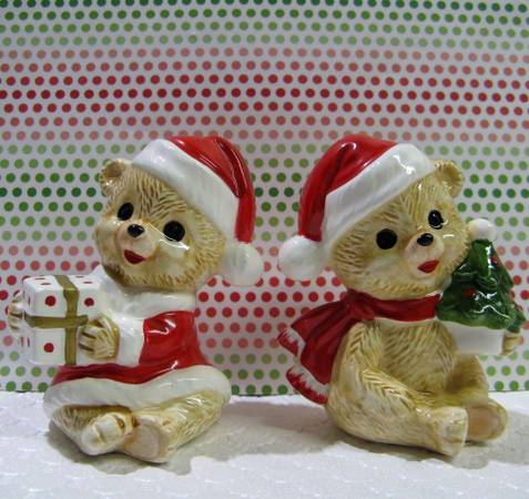 Santa Teddy Bear Salt And Pepper Shakers Vintage Christmas George Good Japan About 3" tall with original stickers and stoppers. Made in Japan.