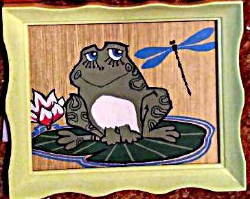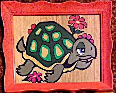 Late '60s-early '70s era vintage paint by numbers 2 piece set featuring one neatly painted frog sitting on a lily pad with a dragonfly hovering nearby in a neon bright plastic yellow frame and one turtle with flowers in a bright orange frame. Both images are painted on a realistic and attractive woodgrain-look background. They'd make a cheerful addition to a child's room or a unique gift for any frog and turtle lover. Size is 8 1/2" x 10 1/2" including frame, or 7 3/4" x 9 3/4" without frame.