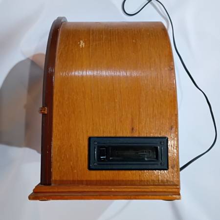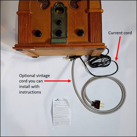 I planned to replace the modern 2‑prong power cord with a vintage‑style cord for a Halloween prop project but never got around to it. I am including the parts so you can swap the cord if desired. Both items were purchased from Snake Head Vintage: