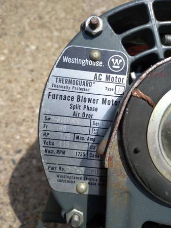 Westinghouse AC Thermoguard AC Furnace Motor Part Number: DNP-05-091 Serial Number: 316P304 Split Phase Over Air FR 48 HP 176 Norm RPM 1725 (wired to plug-in electrical on/off switch.)