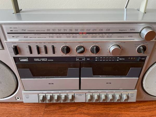 Double Cassette, 2 Way Speaker System Both radio and cassette player work. The antenna is broken (does not extend farther than what you see in the picture), but still works fine. Dimensions: 23.5 x...