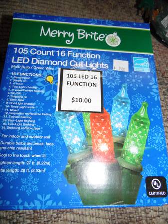 105 Ct Diamond Cut 16 Function LED Lights --New in Box-Half Price-- These diamond cut LED lights are multi-colored and have 16 lighting/motion functions. The lighted length is 27 feet. $10 each –...