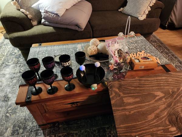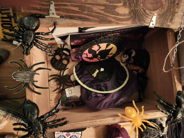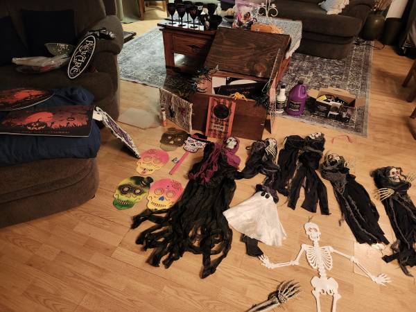 Halloween decorations, smoke machine with juice and cleaner, skeleton, witches, wall decorations, mugs, candle holder and mich more.. wooden chest included to store everything. see pics. 1 stop get everything you need to decorate your party. Asking $70 call or next thanks