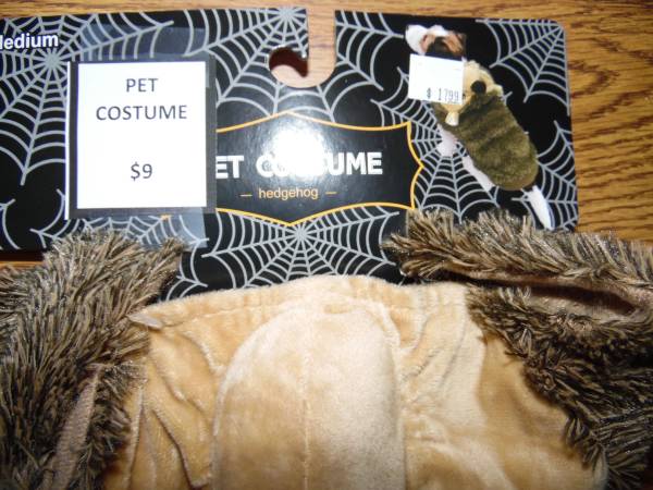 Great Pet Costumes $9 Each --New with Tags-Half Price— Dress your dog in a Halloween costume. Available in the following styles and sizes: Dinosaur – Large Hedgehog - Medium and Extra Large Spider –...