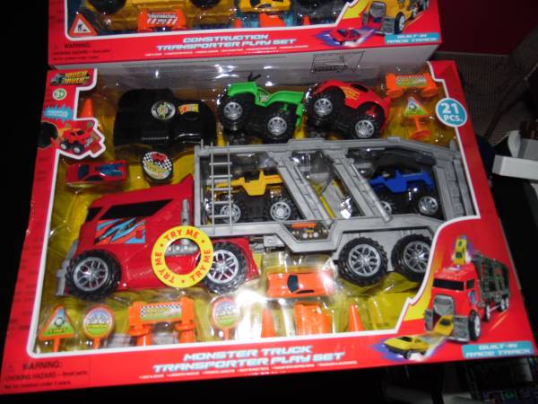 Monster Truck Car Hauler Set --New in Box-Half Price-- This 21 piece car transporter toy set comes with 5 vehicles, a sound and light car hauler (transporter), a powerful launcher, road signs and...