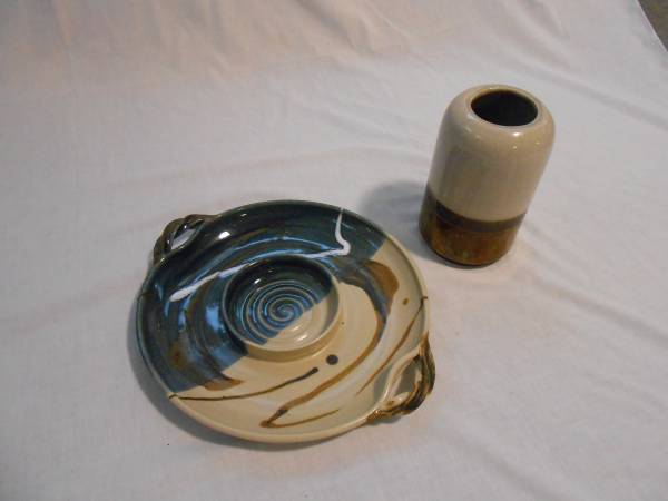 Ceramic Plate, 14.5" diam. and matching vase, 5" diam. x 8" high. Asking $5 for the set.