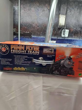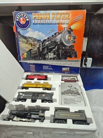 Penn Flyer freight train set. 40 x 60 oval FastTrack layout. Complete with transformer. Engine smokes, lights up and has air whistle.