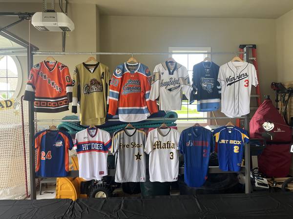 Huge display rack--great for displaying sports uniforms or other items. We used it for a graduation party. Made from wood (painted a dark bronze) and has two tiers of galvanized metal rods. The lag screws in the unit can be unscrewed to break the display down for easy storage and transport. Dimensions are: 8 feet (H) x 10 feet 3 inches (W). $25.