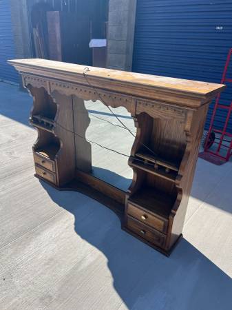 American Drew mirrored hutch/bookcase….very good condition and could be used on top of dresser or even in the closet to house books, shoes or toys! It’s all real wood (oak) and comes with 4 drawers, mirror, light, and shelves. Measurements are 12” deep, 45” tall, and then 67” at the top and 62 1/2” at the bottom. POOS