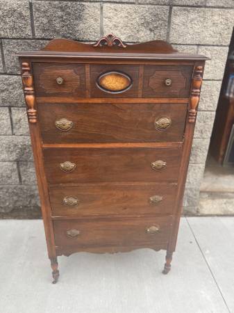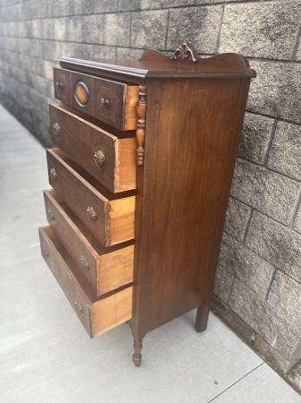 antique 5 drawer highboy chest….good condition and manufactured by the Highpoint Furniture Company. Features all real wood, original hardware, and original wood casters. Measurements are 29 3/4”...