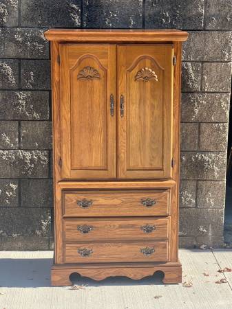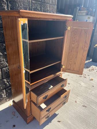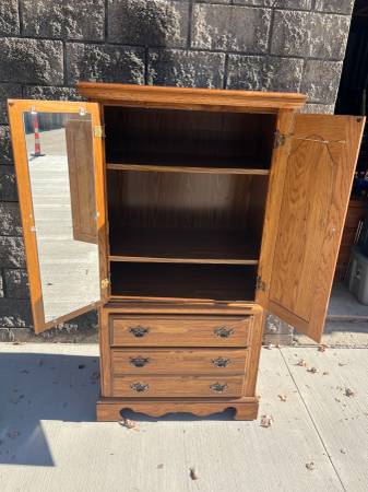 armoire chest in good condition….features 2 drawers and 2 cubby doors with shelves inside. Inside doors have a mirror on one side and a tie ganging rack on the other. Has laminated top, metal on wood drawer slides and original hardware. Measurements are 32 1/4” wide, 19” deep, and 60 1/4” tall. POOS