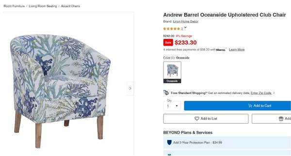I bought this chair online from Gardner-White. Unfortunately, it doesn't look right with my other living room furniture. I didn't want to pay the 25% restocking fee and return delivery charge in order to get a refund from the store and hoping someone else can use this chair. I paid over $270 but found the chair on sale at Bed Bath & Beyond for $233 (not including tax, delivery charge, etc.) (see image). The chair hasn't been used at all (meaning, it has never even been sat in and the tag is still affixed to it). No pets, no smoking home. Also, the chair is covered with a bedsheet in order to keep any dust from forming on it.