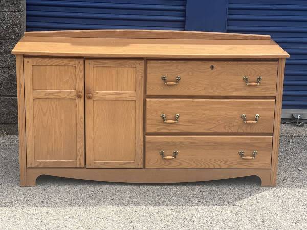 4 drawer plus storage golden oak dresser…..good condition and features laminate top, roller glides and original hardware. Cubby door has an adjustable/removable shelf inside. Measurements are 62”...