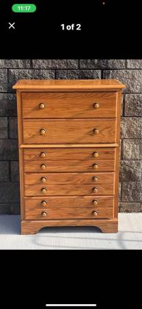 golden oak 5 drawer highboy chest….good condition and features real wood, metal drawer slides and original hardware. Message 34” wide, 17 1/4” deep, and 49” tall. POOS