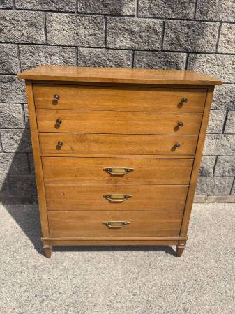 Harmony House mid century 5 drawer highboy chest…..good condition with some scratches and wear so perfect piece to paint or refinish! It’s all real wood with dovetailed drawers, and wood on wood drawer slides. Measurements are 38” wide, 19” deep, and 47” tall. POOS