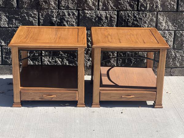 matching oak end tables….very good condition and features small drawer on the bottom, along with decorative metal design. Measurements are 26” wide, 26” deep, and 23 1/4” tall. POOS