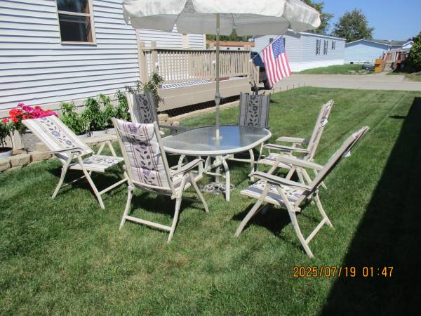 table ,6 chairs, umbrella, and, stand, table and chairs are powder coated, chairs are foldable for easy storage also the cushions are waterproof and, recline to 4 positions, cash only, no emails !