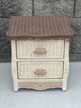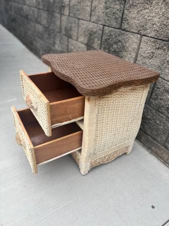 Pier 1 Imports 2 drawer nightstand….good condition, just needs a good cleaning. Made of wicker and rattan. Drawers are on roller glides and has original hardware. Measurements are 21 3/4” wide, 18”...