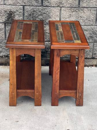 Riverside Furniture Co matching slate top end tables…..no cracks, chips or damage…good condition and features bottom shelf. Very unique and different! Measurements are 13” wide, 28” deep, and 24...