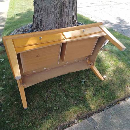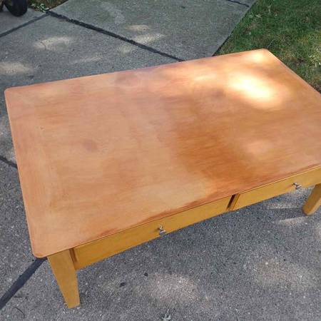 used prev owner tried sanding and restaining top..did not work well top is wood veneer larger size not small.....sturdy well made table