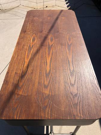 Metal writing desk in good shape. 48” wide x 22” deep x 31” tall. Two drawers. Light scratches on wood top. Best offer.