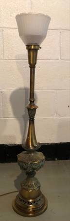 This is a vintage and elegant looking gold table lamp that can be used with or without its shade. It measures 43 inches tall. Please see the photographs for complete details.