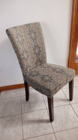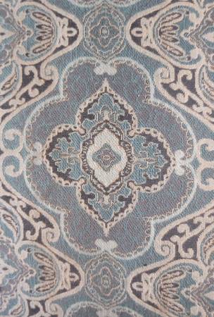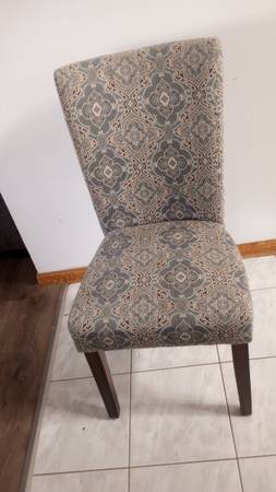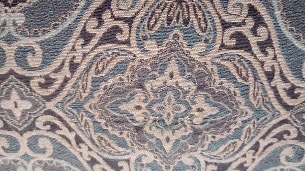 This chair measures about 38" tall x 19" wide on front of cushion. Color most closely matches the close up photos. It is hard to capture the color exactly, but there is a light, slightly aqua, light blue, gray, and off-white. Wooden legs.
