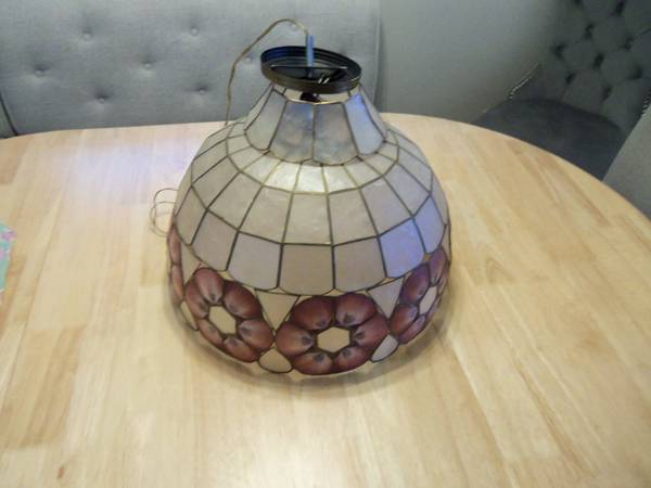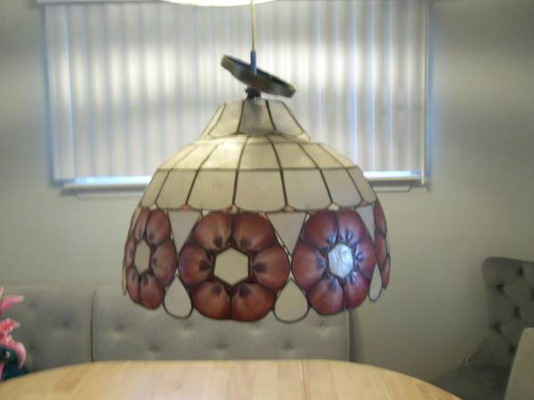 Selling a rare mid century capiz shell shade hanging light. Floral design. Beautiful when lit up. It actually has two pieces. The top part I have flipped around for safety reasons. Do not want it to crack or chip. The piece on the very top is the cover for the ceiling where the electrical wire comes from. Please ask if you have any questions.
