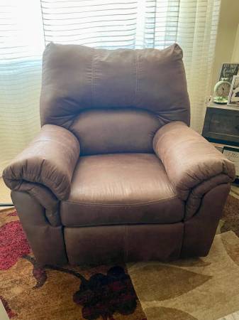 SHARP ABD CERY COMFORTABLE ROCKING MANUEL RECLINER FOR SALE. COLOR IS BROWN MATERIAL IS A SOFT LEATHER CLOTH. ONLY 4 MONTHS OLD EXCELLENT CONDITION MUST SELL. CALLS ONLY PLEASE NO TEXTS. JENNIFER ....
