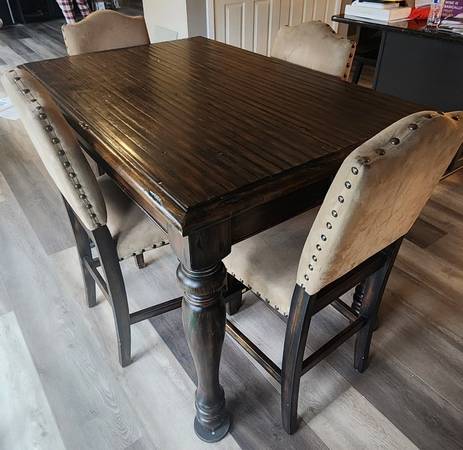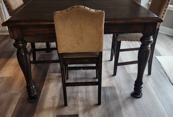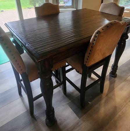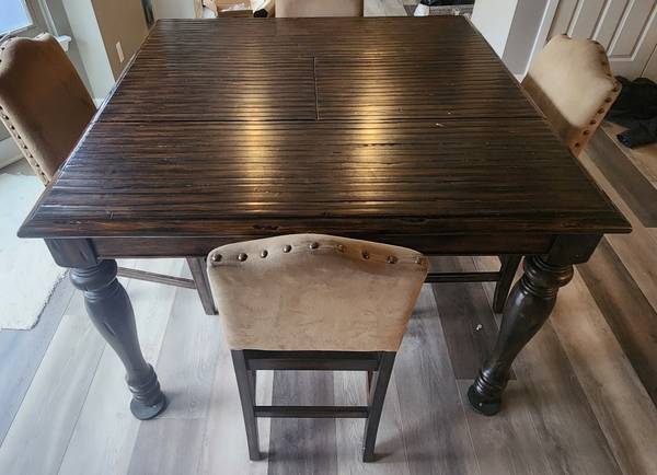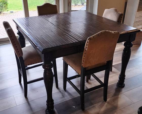 This is a sharp rustic farm house style 7-piece counter height dinning set that can seat up to as many as 8 or for a smaller feel 4. We purchased this from Sam's Club and its quality is very solid. This is a well built heavy duty set that is meant to last. It has a center leaf that folds in half and stores below table until needed. Perfect for entertaining due to its ability to expand. We are down sizing and this needs to find a new home. Just in time for the holidays..